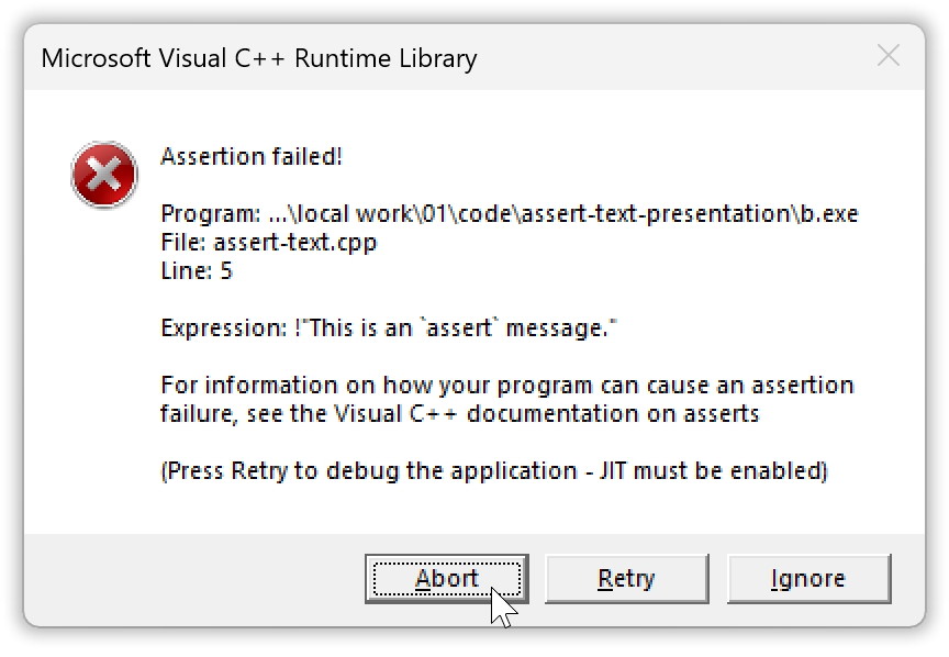 > cl assert-text.cpp msvc-assertion-fix.cpp /Feb /link /subsystem:windows