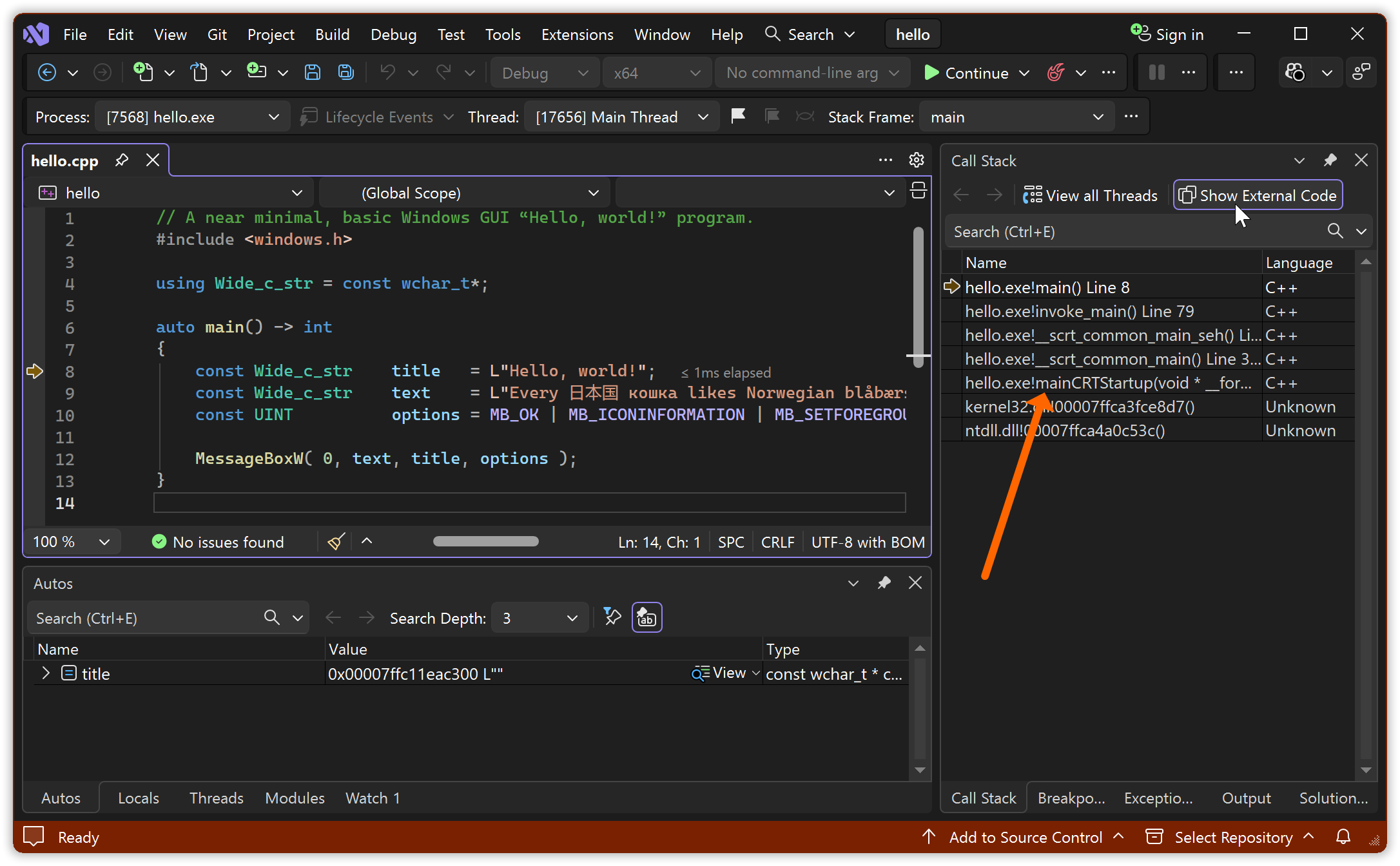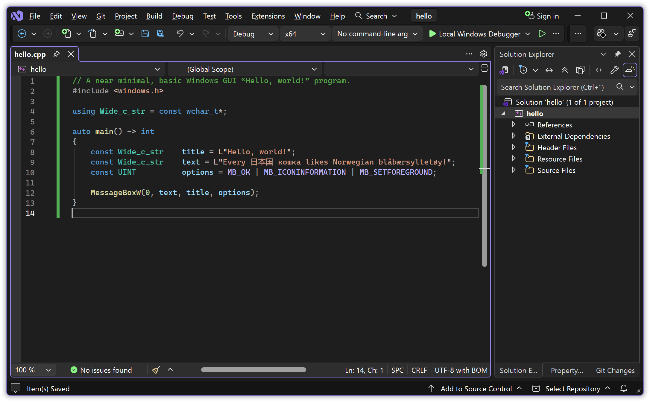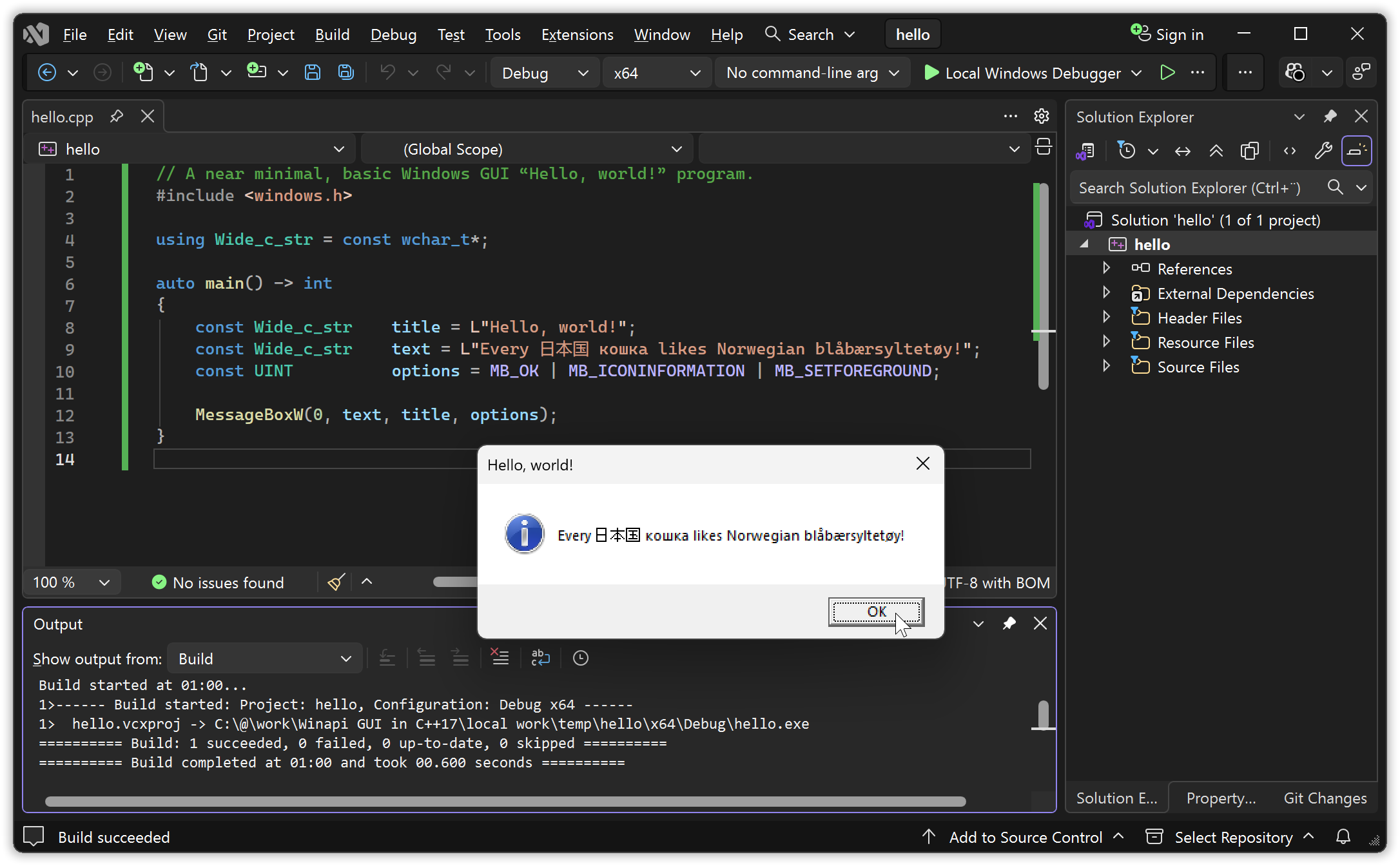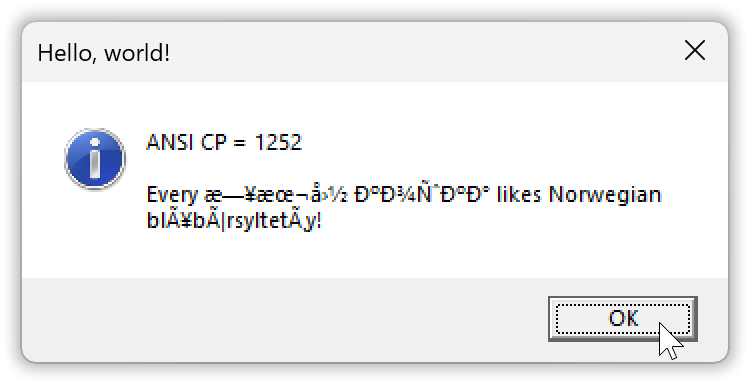 The gibberish-by-default result is why I didn’t use char based MessageBoxA here, as most tutorials do — they hide the problems and how limited that approach is by presenting only text with the letters restricted to A trough Z… Unfortunately configuring the ANSI functions’ encoding assumption to UTF-8, to handle e.g. the above text correctly, involves both extra non-C++ source code and extra tool usage. So for a while we’ll continue to use the basic wide functions.