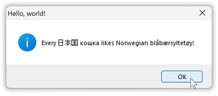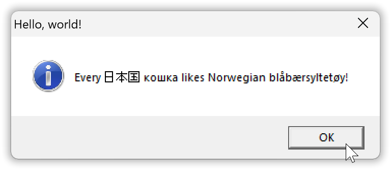 And that’s what the suffix W in the name MessageBoxW is about: it indicates a wide string based function. There is also a char-based message box function called MessageBoxA. It’s just a thin wrapper that translates its char based argument strings to wide strings, by default under an archaic text encoding assumption that produces gibberish results such as “Every 日本国 кошка likes Norwegian blÃ¥bærsyltetøy!”, and calls MessageBoxW which is the basic API function.