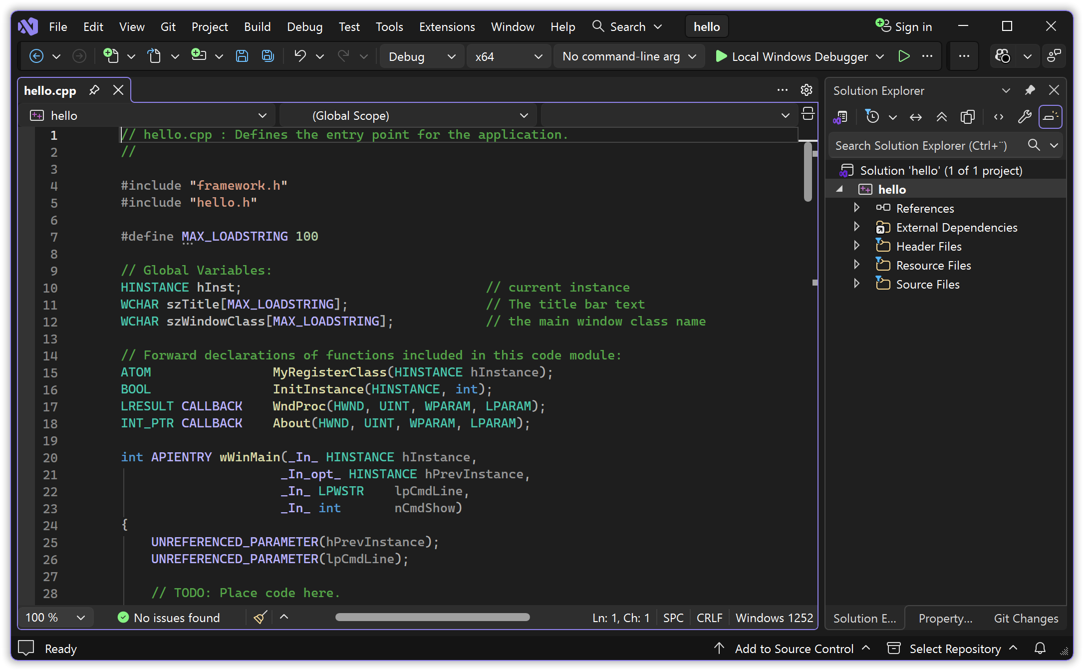 Winapi GUI in C++17 Chapter 1 – Building a GUI message box “Hello, world!” in Visual Studio.