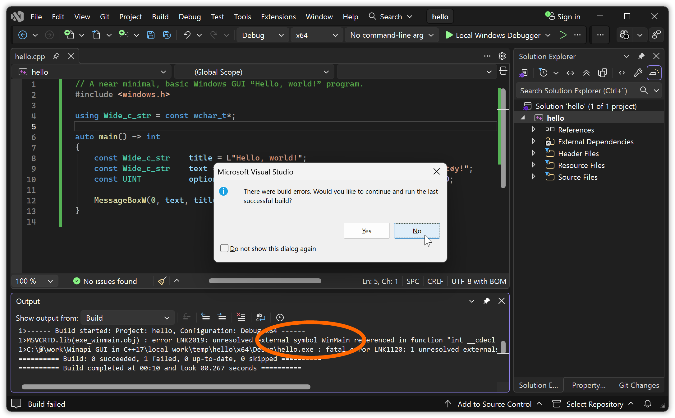 Hit Ctrl+F5 to attempt to build and run. Since Microsoft’s linker by default doesn’t accept a standard main for a GUI program, this will fail. The Microsoft linker complains about an allegedly missing “WinMain”.
