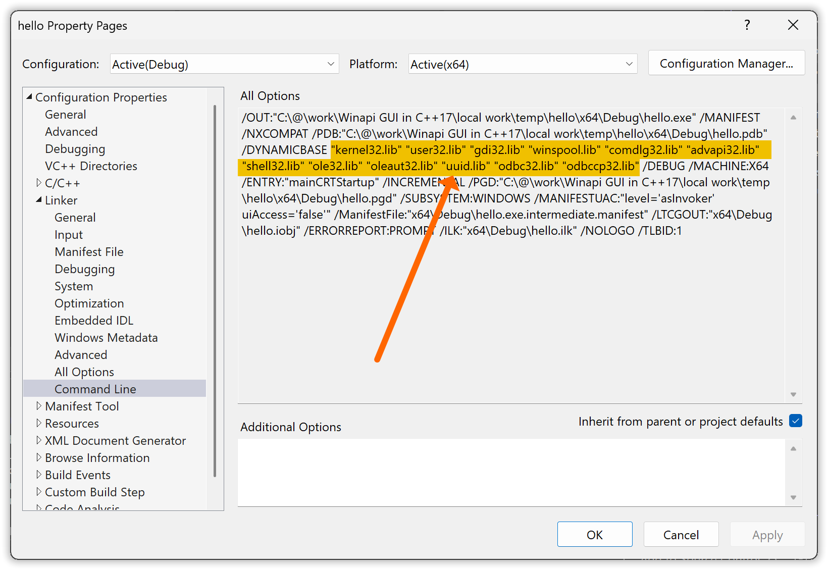 So ideally the list should be trimmed down to just “user32.lib”, the one library that the program explicitly actually uses. The program, as all Windows programs, also uses “kernel32” via the runtime library, but all compilers add “kernel32” by default because all programs need it. To trim down the list you can change the linker’s library list, specified in Configuration Properties ▸ Linker ▸ Input field Additional Dependencies, from