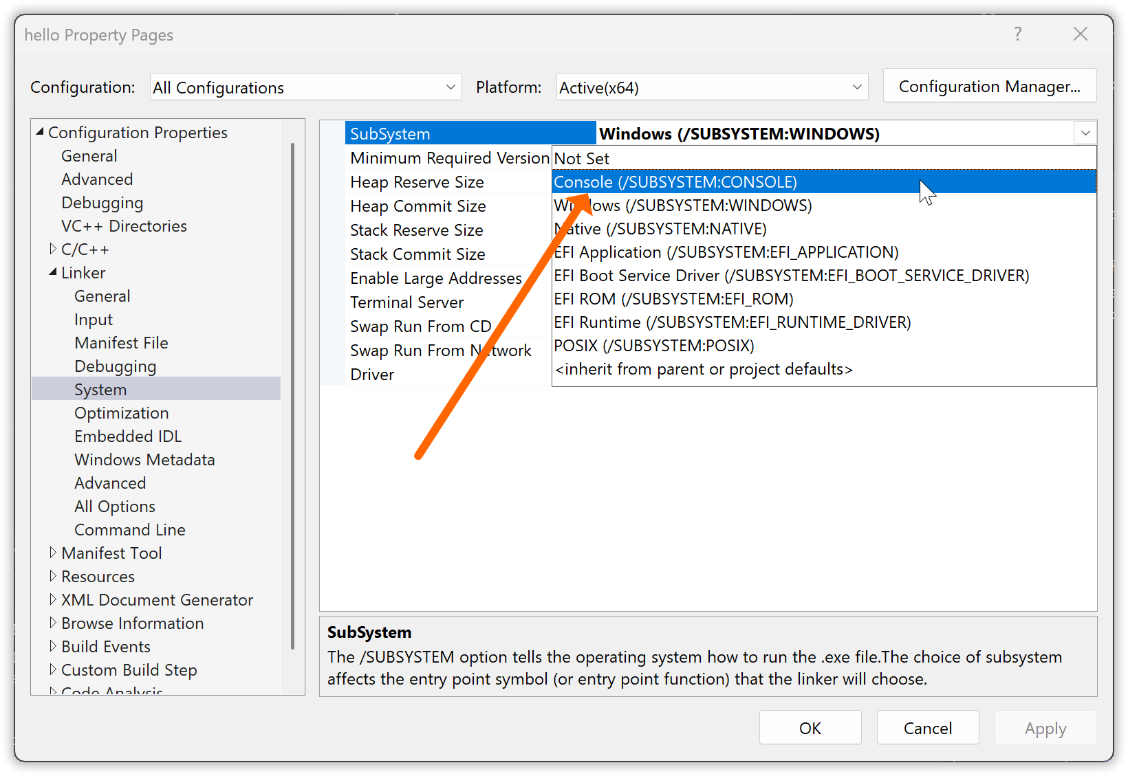 | Specification in linker options: | console |